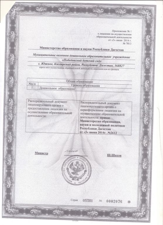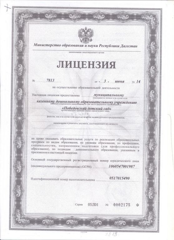 Полное наименование образовательной организации* Муниципальное казенное дошкольное образовательное учреждение "Победовский детский сад" Кизлярского района РД